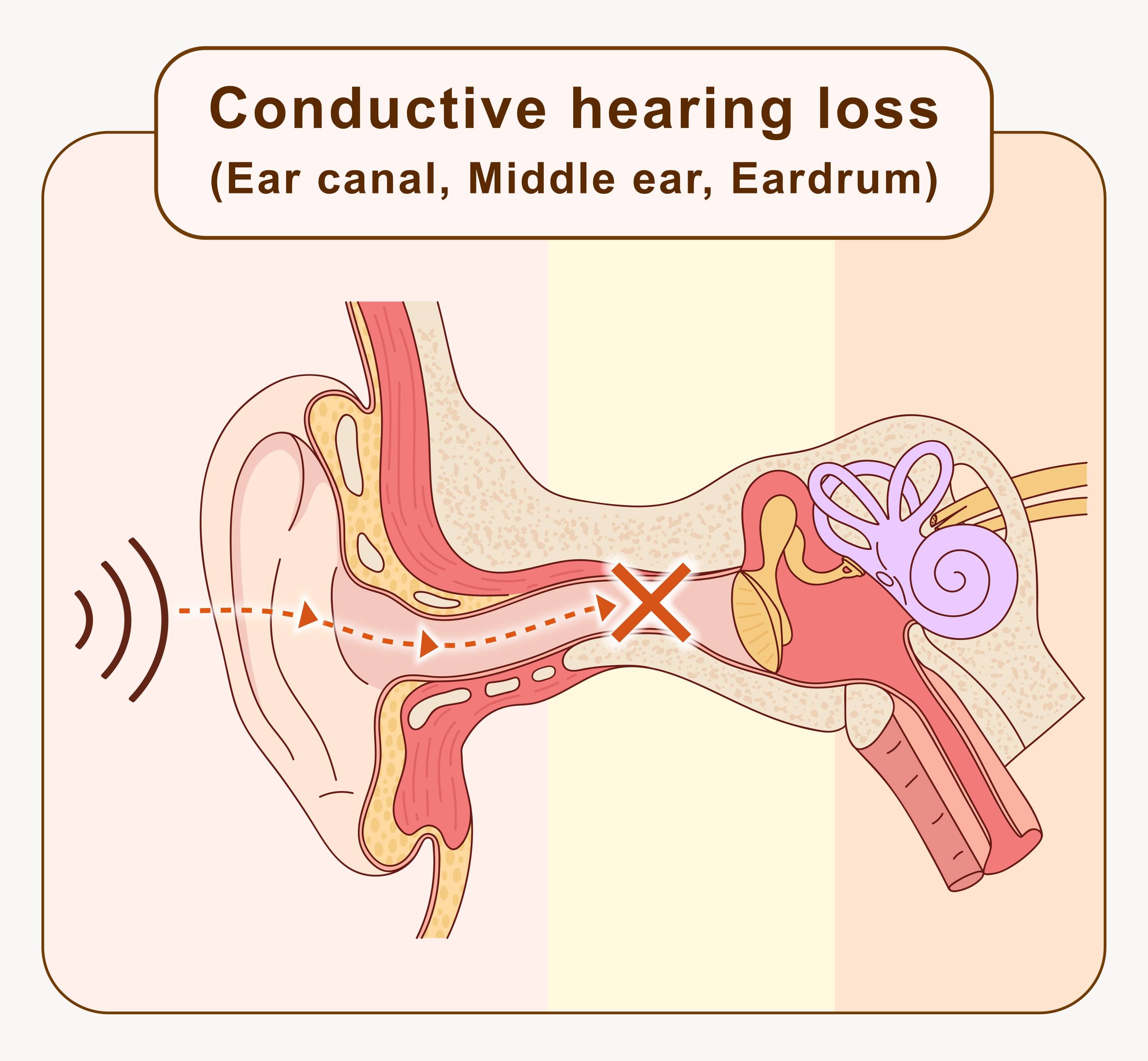 Conductive hearing loss occurs when sound is blocked during its transmission to the inner ear. Problems may involve the external auditory canal, eardrum or middle ear such as earwax buildup, ear infections etc; it is the most common cause of hearing loss in elderly.