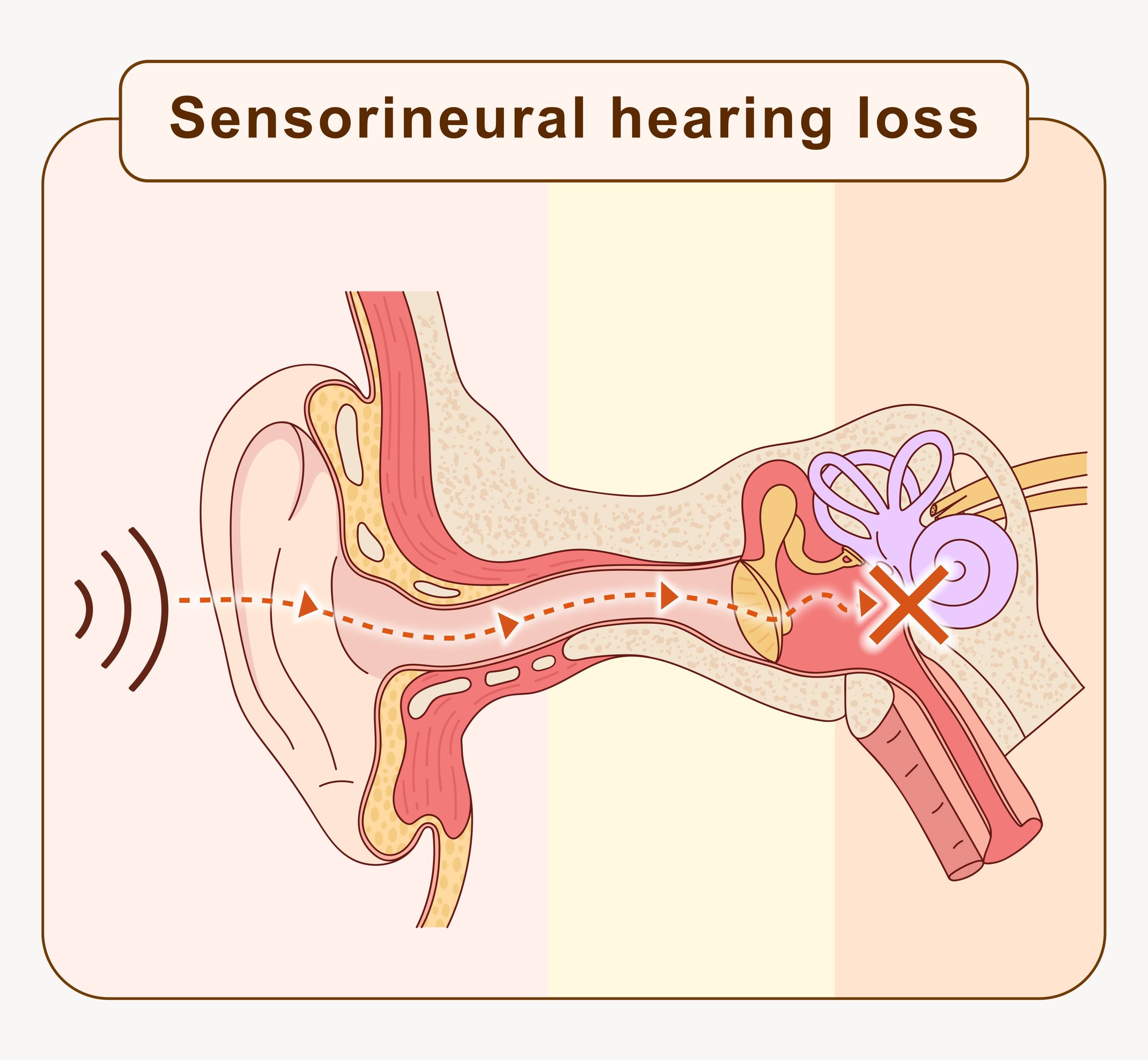 Sensorineural hearing loss occurs when sound reaches the inner ear, but the sound waves cannot be converted into nerve impulses (sensory hearing loss); or because nerve impulses cannot be transmitted to the brain (neural hearing loss). Causes may include illness (e.g. sudden deafness), degenerative changes, medications (e.g. the side effects of ototoxic drugs and some cancer treatment medications), noise exposure, or genetics (congenital hearing loss accounts for approximately 0.3%).