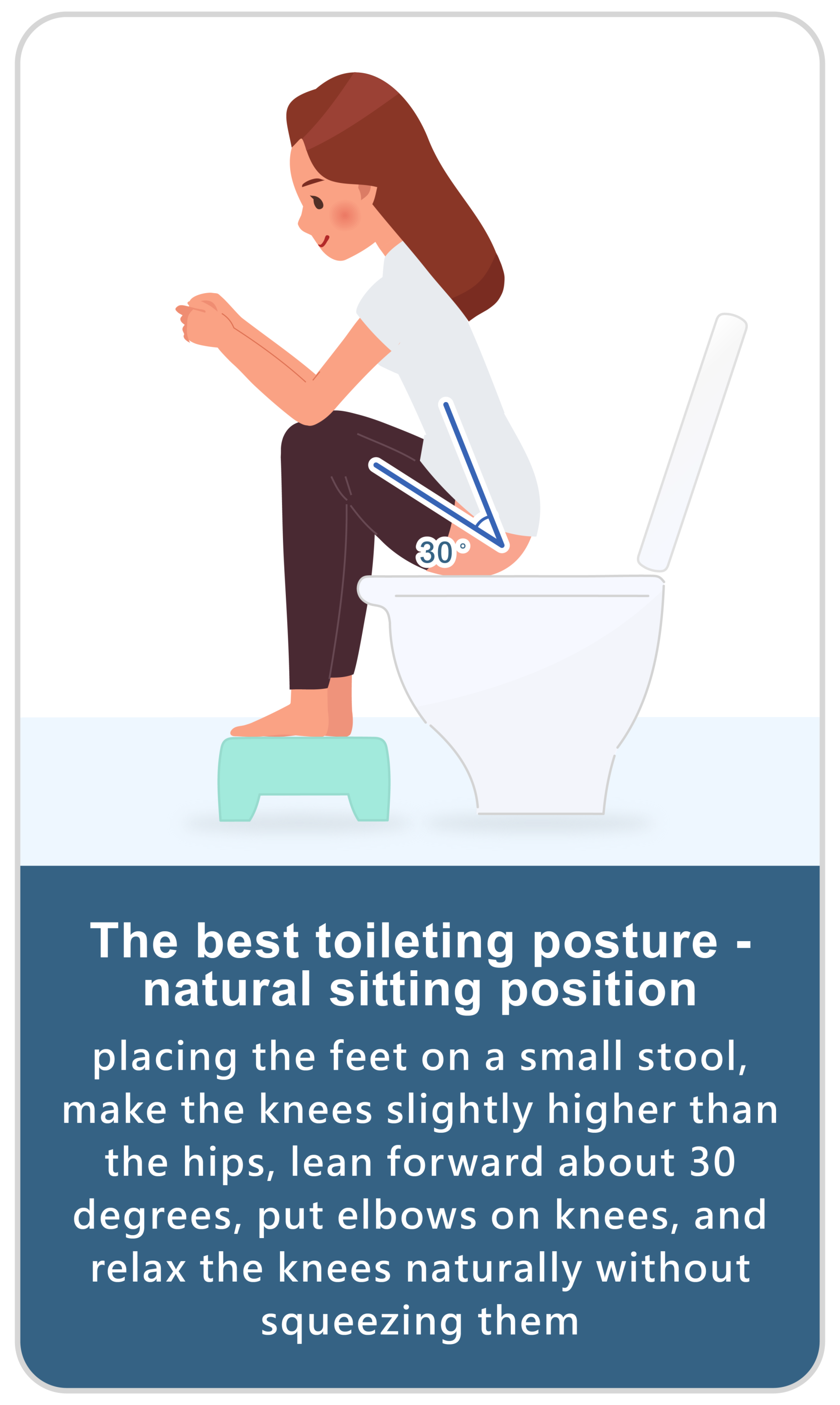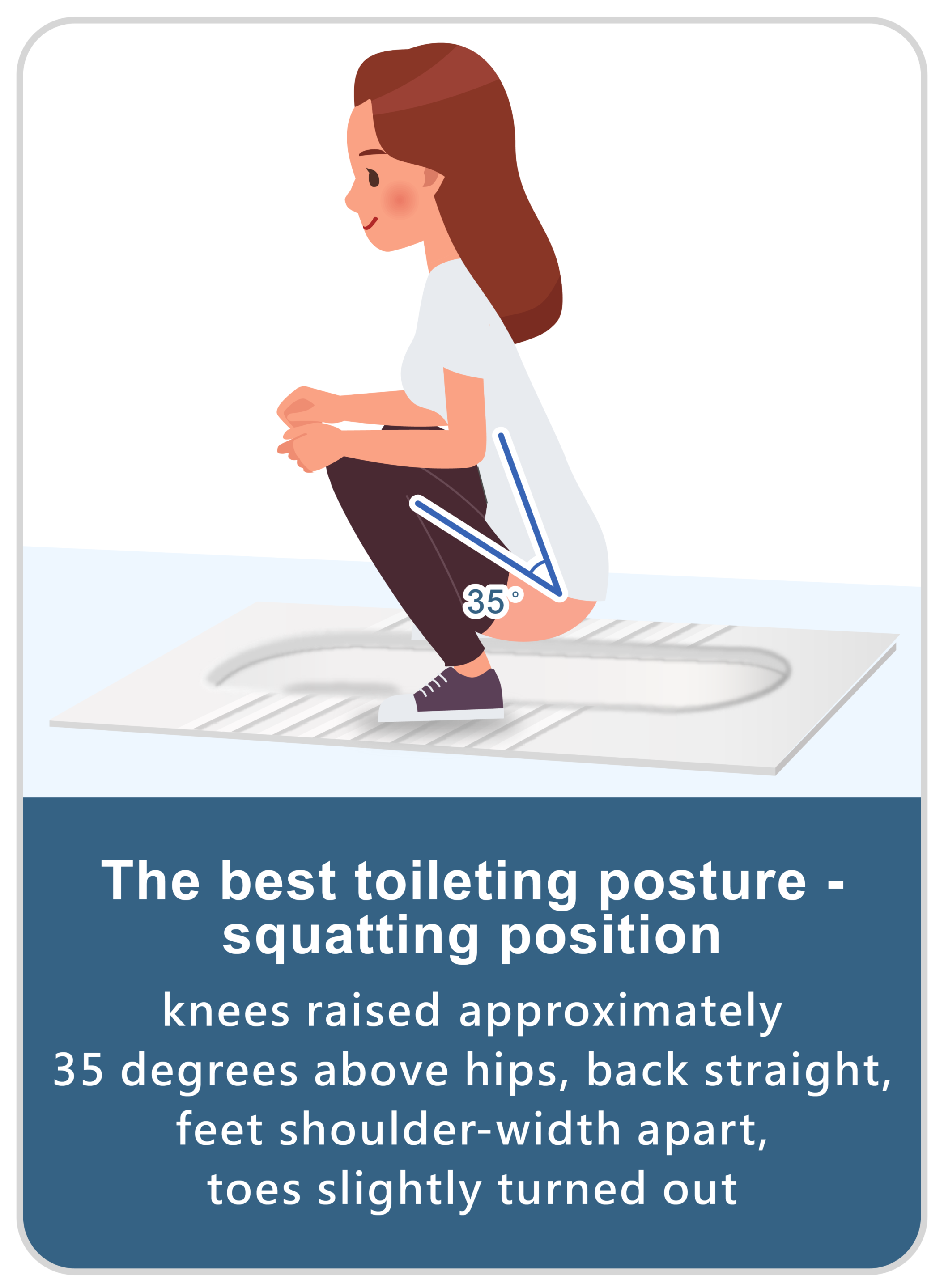 The optimal toileting posture depends on the style of toilet and individual's body strength and balance. For example, for the sitting toilet commonly used in Hong Kong, we can apply additional equipment if possible and adjust the body to achieve a posture close to a natural squatting posture, such as placing the feet on a small stool, place the knees slightly higher than the hips, lean forward about 30 degrees, put elbows on knees, and relax the knees naturally without squeezing them.