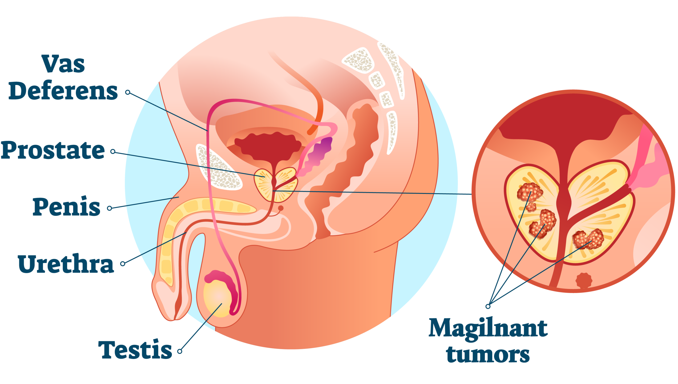 The prostate is part of the male reproductive system, it is a gland located beneath the bladder and shaped like a walnut. It contributes additional fluid to mix with and carries sperm to form semen. While benign prostatic hyperplasia is a common issue, gene mutations in prostate cells can lead to the formation of malignant tumours, known as prostate cancer.