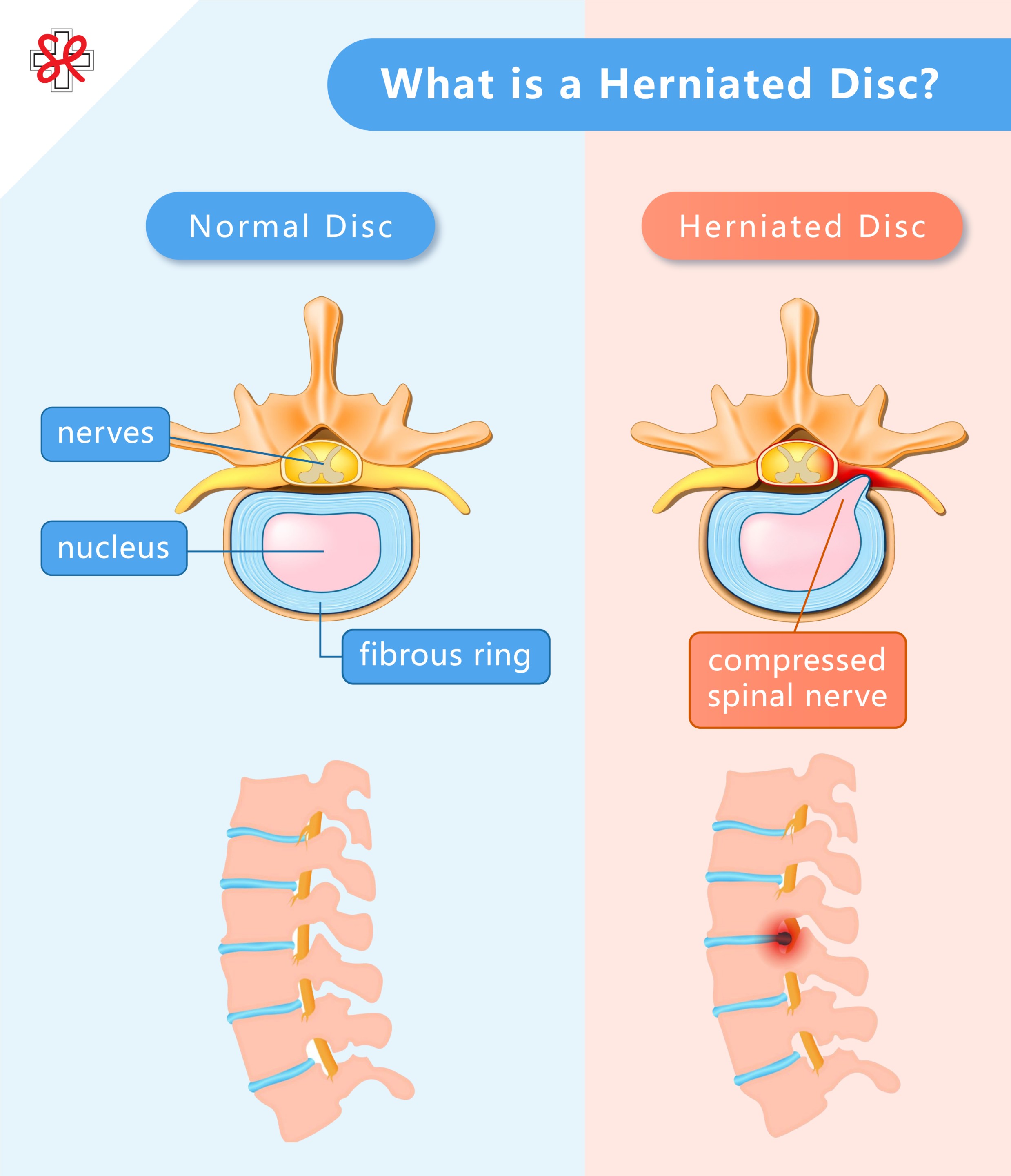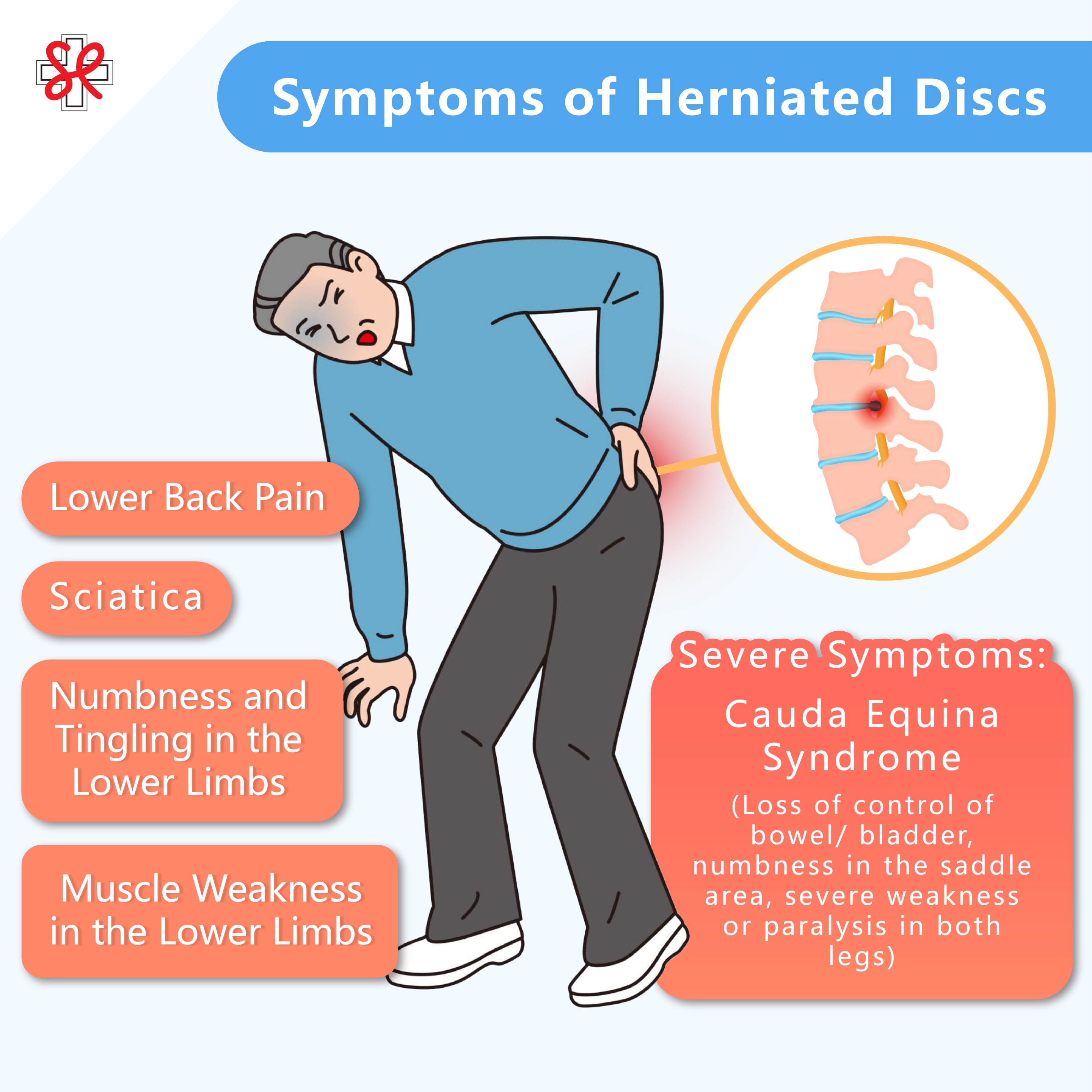 - Herniated Disc: A specific structural issue that only causes sciatica symptoms (lower limb numbness/ pain) when it compresses a nerve.