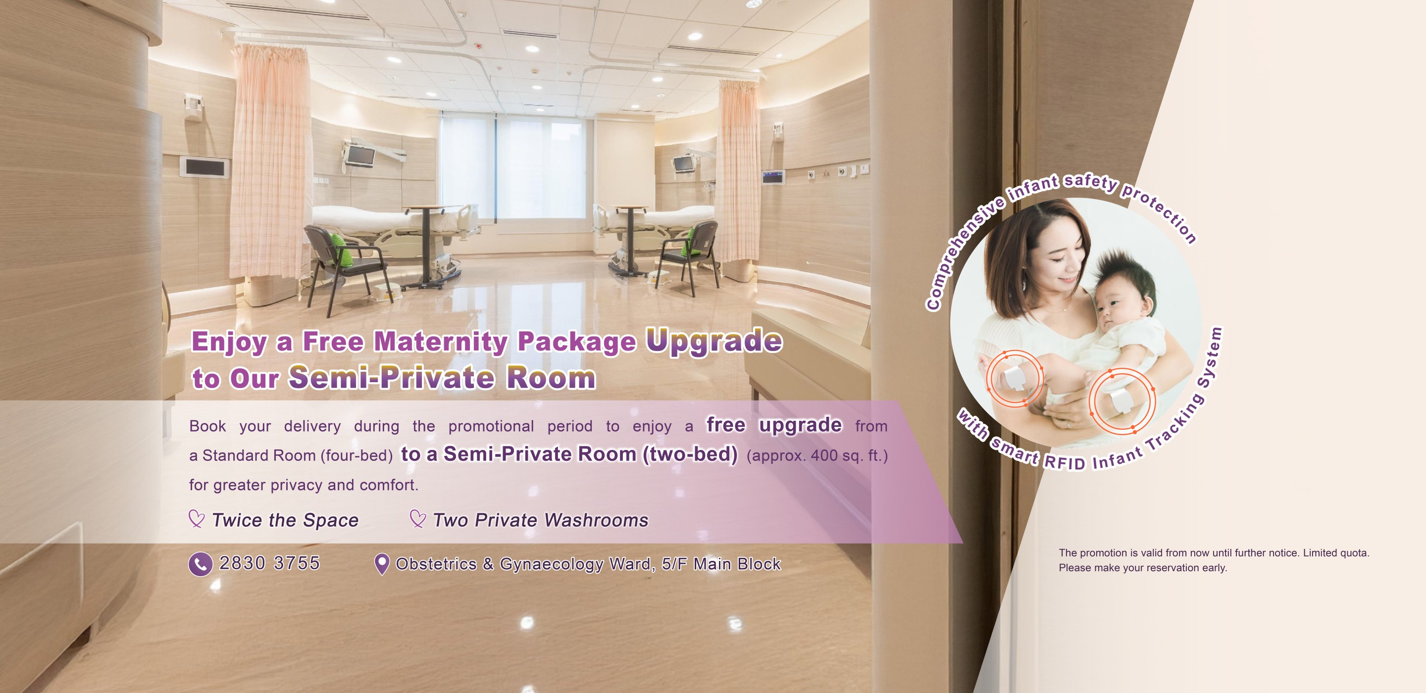 3. This promotional offer refers to a free upgrade from the “Standard Room (4 persons) Maternity Package” to the “Semi-Private (2 persons) Room Maternity Package.” Please discuss the doctor's fees for the delivery service directly with your attending obstetrician.