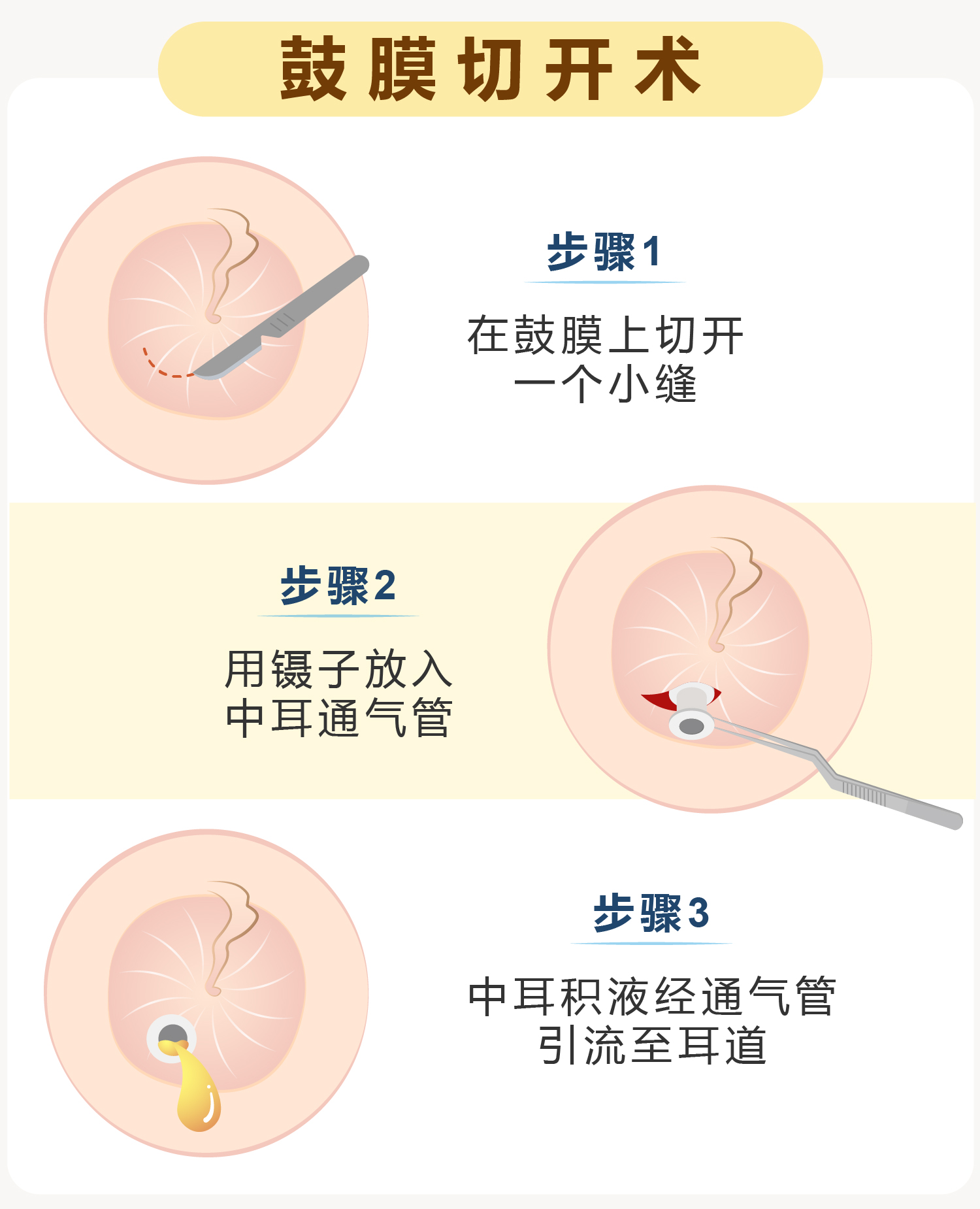 当中耳积水或咽鼓管阻塞的问题严重影响患者(如:听力丧失)时,医生会运用鼓膜切开术的临床程序,抽出中耳内的液体,改善中耳内压力。