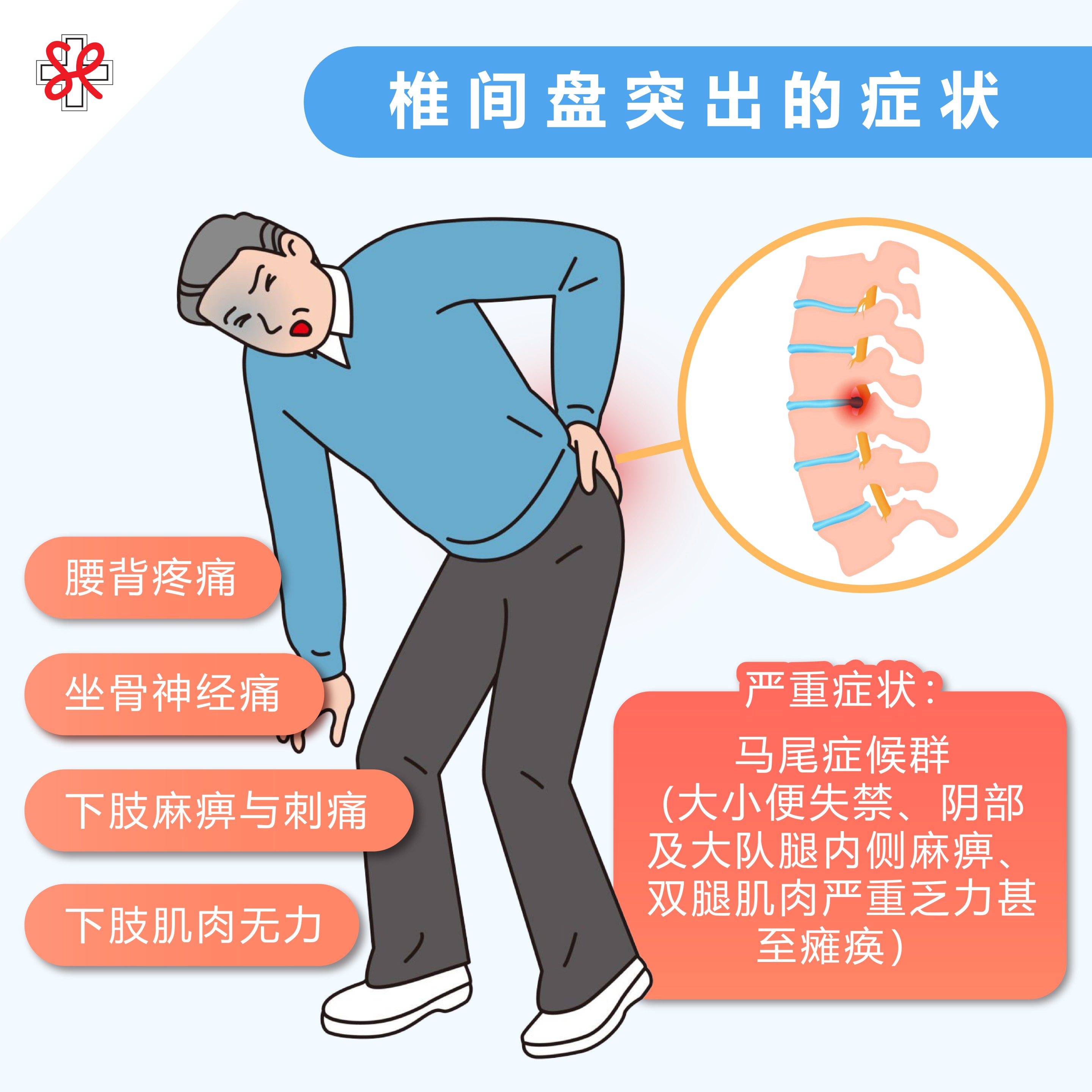 在少数情况下,如果椎间盘严重压迫马尾神经(位于脊椎底部的重要神经束),会出现以下危险信号: