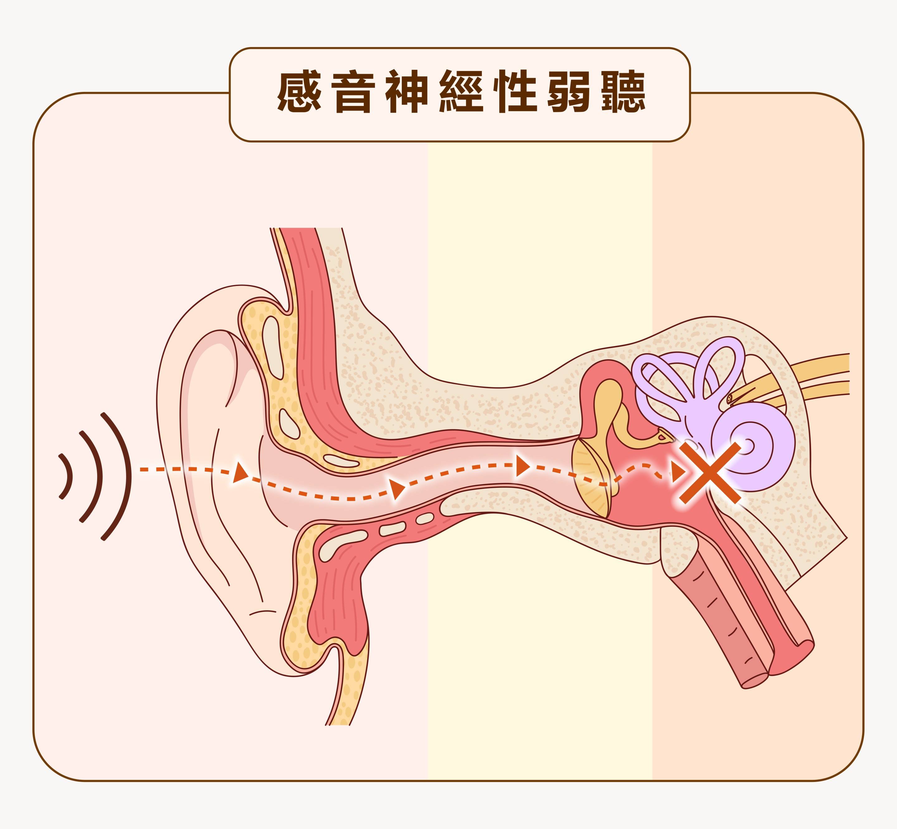 感音神經性弱聽發生時,聲音能傳到內耳,但因聲波不能轉化為神經脈衝(感音性損失),或神經脈衝無法傳遞到大腦(神經性損失)而失去聽力。成因有機會為疾病(如:突發性耳聾)、機能退化、藥物(如:耳毒性藥物及一些癌症藥物)、噪音或遺傳(先天性大概佔0.3%)所引致。